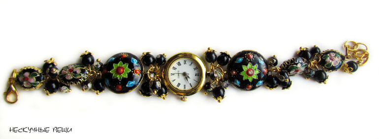 часы, часики, наручные часы, наручные часы в подарок, часы-браслет, часы с браслетом, браслет с часами, Клуазоне, подарок девушке, подарок женщине, женские часы, золотой, золотистый, золотые часы, черный, черные часы