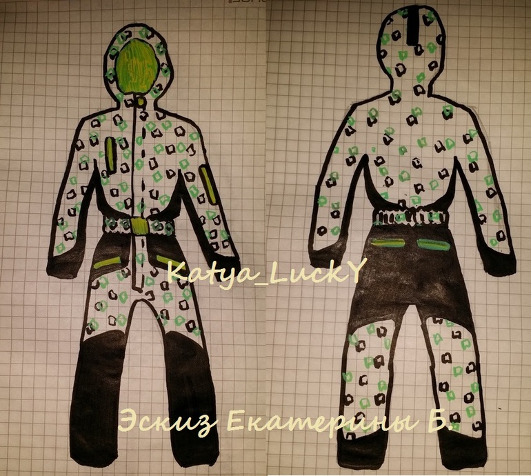 Основная идея предлагаемой модели - яркий и светлый комбинезон, основные нагруженные и пачкающиеся части сделать темными и неубиваемыми. Все линии вставок повторяют округлости "квадратов" принта.