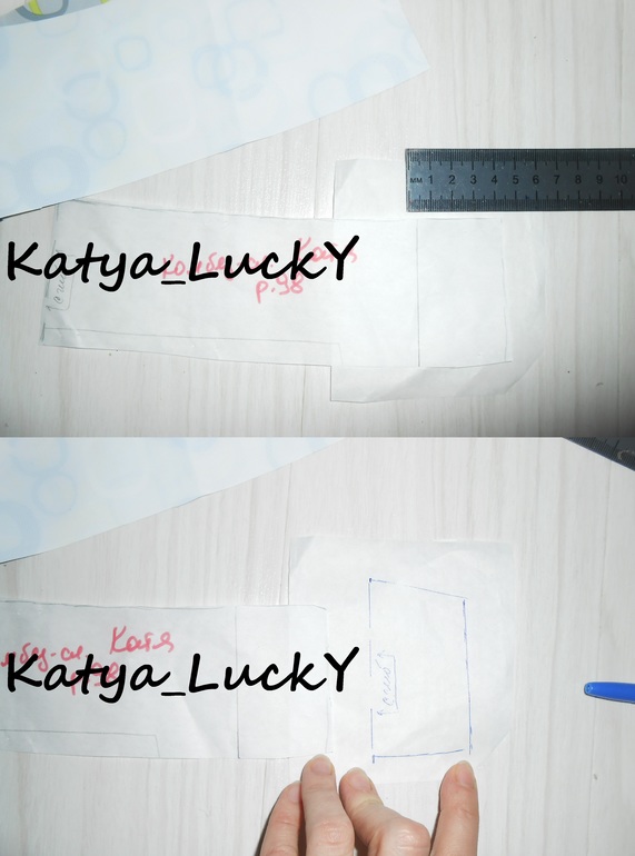 Поскольку, в кармашки должны войти ушки и ваш палец, чтобы зафиксировать их там, то кармашки выкраиваются не как прямоугольник, а как трапеция. Берем выкройку воротника, ширина кармашка 4-5см, высота = высоте воротника, а край по сгибу - верх поднимаем на 1см. Выкраиваем кармашки (не забудьте, что сгиб детали идет не по линии центральной молнии, а по линии входа в кармашек!)
