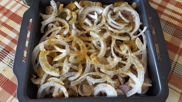 Режем лук полукольцами и выкладываем поверх грибов и ещё раз солим и добавляем специи.
