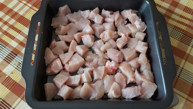 Сначала режем курицу кубиками. Выкладываем в форму слоем и солим перчим и я добавила ещё карри и немножко тмина и сухого чеснока...