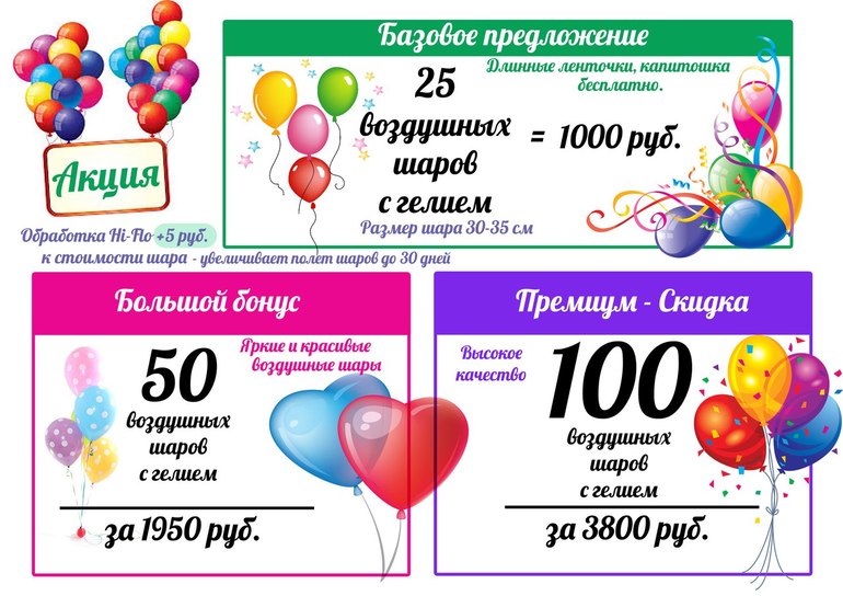 У нас Есть вся цветовая гамма шаров. Шары обрабатываются специальным раствором для долгого полета. Большой выбор ленточек. Стоимость шаров от 30 рублей.