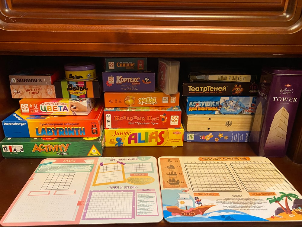 Вот собственно наша полка с настолками)) сейчас девочкам 7 и почти 12 лет. Вот что мы собрали года за 2 наверное, до этого настольными играми не увлекались.