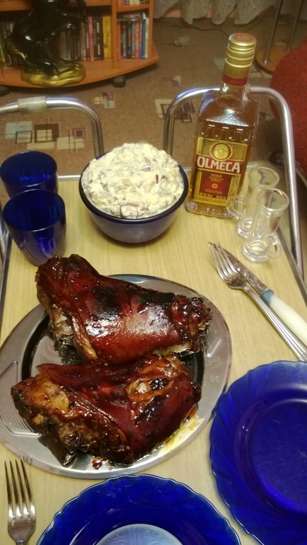 Когда мы закончили готовить эти чудесные рульки и достали их из духовочки-мы поняли что есть просто так эту красоту нельзя(как говорит один мой знакомый-не превращайте закуску в жратву)и из закромов появилась бутылочка нашего любимого напитка текилки.