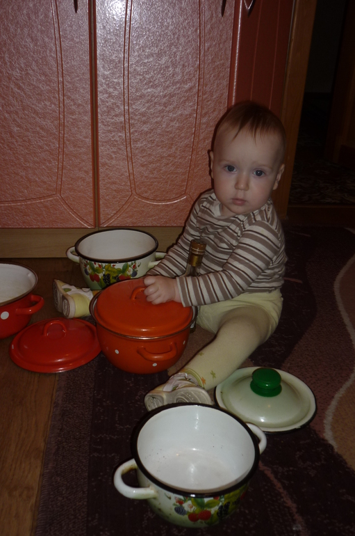 Любит самостоятельно рассматривать книги, показывает многих животных пальчиком, если спрашиваю. Обожает играть с кастрюлями, обычными кухонными кастрюлями, видно растёт будущий шеф-повар, дастанет все из шкафчика и открывает-закрывает крышки, а может взять в руку крышку и таскать её полдня по всей квартире)))