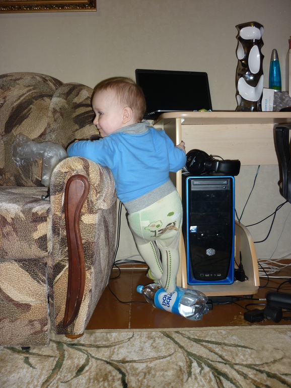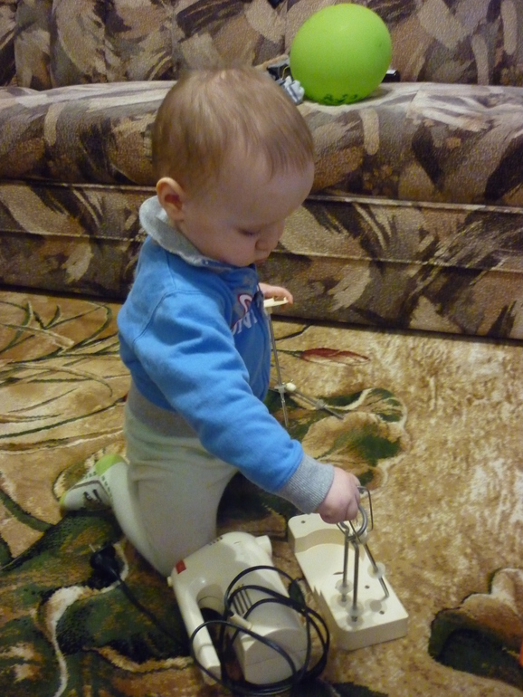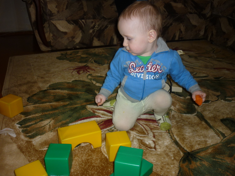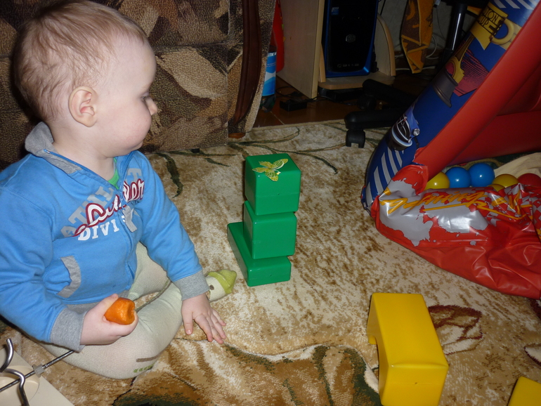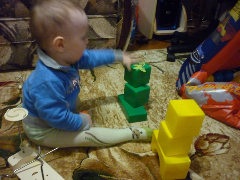Зачем ему башенки, когда лучше всего можно покататься на бутылке или с насадками от миксера старого поиграть, Хотя тоже в принципе хорошая игра, вставлял насадки от миксера в маленькие дырочки)))