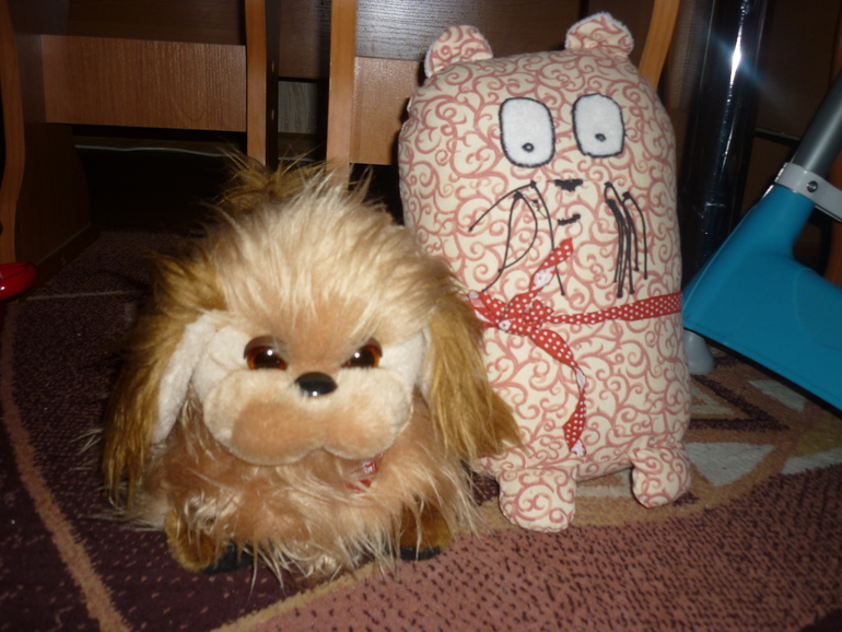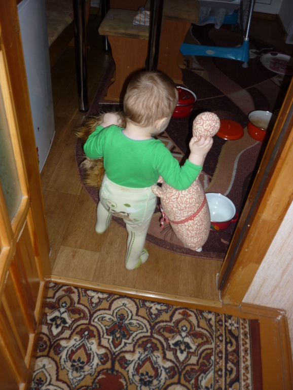 Дамирушка знает, где у нас стоит собачка, поэтому на мою просьбу принести её, принёс. Я рассказала ему, что собачка дружит с котиком, но они часто ругаются. Домиков правда для них мы не построили, но ролевую игру, где собачка бежит за котиком и гавкает показала ему, а котик прятался высоко в Дамиркин стульчик)). Дамирке очень понравилось, на моё удивление(думала сразу, что не поймёт) и просил несколько раз повторить, затем я дала котика малышу и сказала убегать от собачки и он убегал, а я с собакой догоняла))))) В конце кот и собака подружились))) И Дамирушка их двоих тягал по квартире))