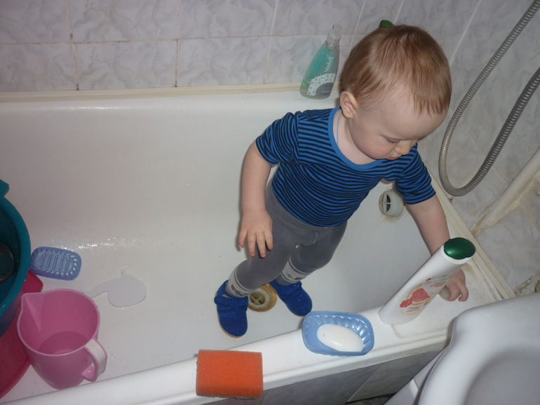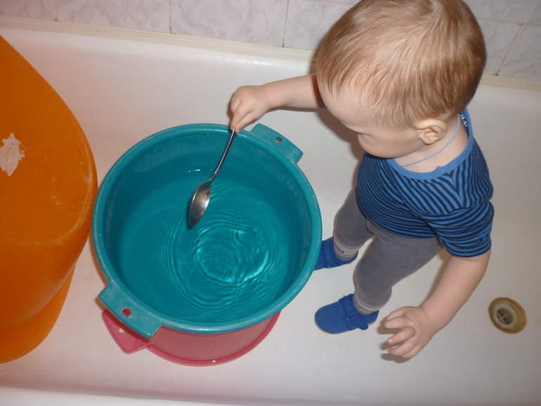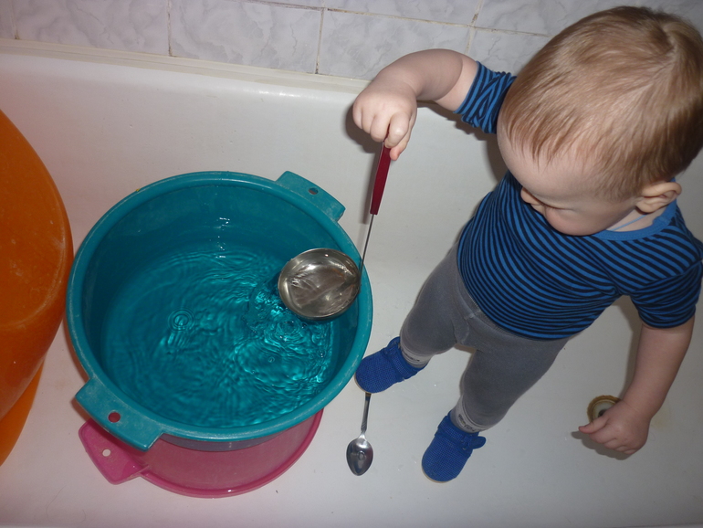 Вот с водой у нас получше. Дамирке очень понравилось черпать воду черпаком из тазика, ложка его не заинтересовала, чашка тоже, а вот черпаку обрадовался очень и играл с ним хорошо