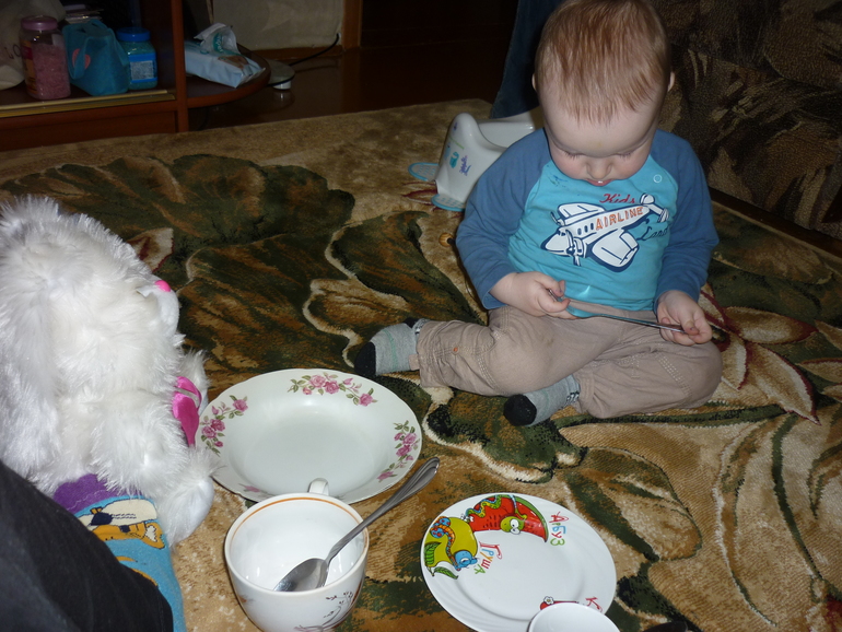 Через некоторое время решила взять большую и маленькую игрушку и соответствующую им посуду, начала рассказывать сыночку, кто большой, а кто маленький и кто из какой посуды ест и кого как нужно покормить. Дамирушка дал не много поесть зайчику, а потом начал баловаться с посудой и пошёл гулять по своим делам. Думаю в эту игру можно будет поиграть, когда немного подрастём, а сейчас она малышу ещё не совсем понятна и интересна.