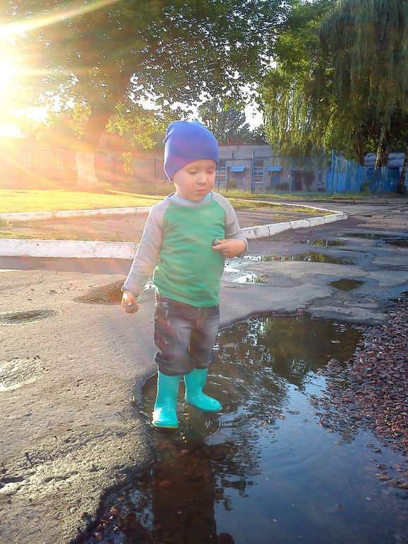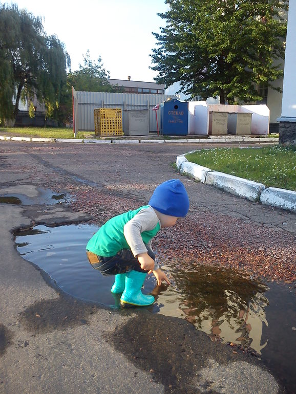 Когда на улице лужи, мой сладусик с радостью по ним бегает. Поначалу Дамир аккуратненько обходил все лужи и даже намёка не имел туда лезть, но мама всегда ищет себе заботы, одела ребёнку резиновики и говорю "Иди сынок бегай по лужам", с начало он осторожно ходил вокруг луж, а потом освоился и за уши уже было не вытащить. Однажды в парке упал в грязевую лужу прям попой, вот это зрелище было, благо была сменная одежда собой, быстренько переоделись и довольные пошли дальше играть.