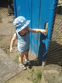 Ездили на той неделе в деревню к моим родителям, сколько у Дамирки было эмоций, восторга, радости. Увидев дедушку (моего папу), когда он приехал нас забирать, залез на руки и ни к кому не хотел идти, даже на горшок я не смогла усадить, дедушка сажал. У папы моего есть машина, а Дамирка авторитетно относится к тем у кого есть машина, он так ждал дедушку, чтоб на ней покататься. В деревне малыш всё время проводил на улице, встанет в 7 часов утра и бегом на улицу, в дом еле-еле затаскивала поесть и поспать. Мои родители содержат живность(поросят, курей, собака, кошка) вот с ними Дамирка всё время и тусовался, подкармливал, за хвосты ловил, на собаку пальцем грозил, чтоб не прыгала на него) Там тоже нашёл двери, от которых не отходил, открывал-закрывал.