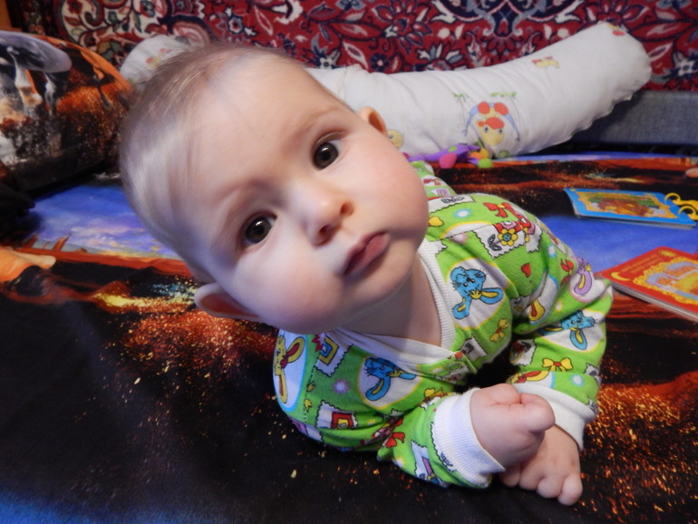 Ну, что сказать, растет забияка, тянет все, что оказывается в досягаемости, с дивана упорно залезает на компьютерный стол, с радостью дергает за волосы и смеется. Спать по утрам вместе уже невозможно, не заметишь, как свалится. Да и как раньше с нами среди ночи не засыпает, ворочается, ползет сонная, ноет. Не знаю, что за прикол, спать попой кверху, уперевшись головой в самый краешек кроватки, может что болит?