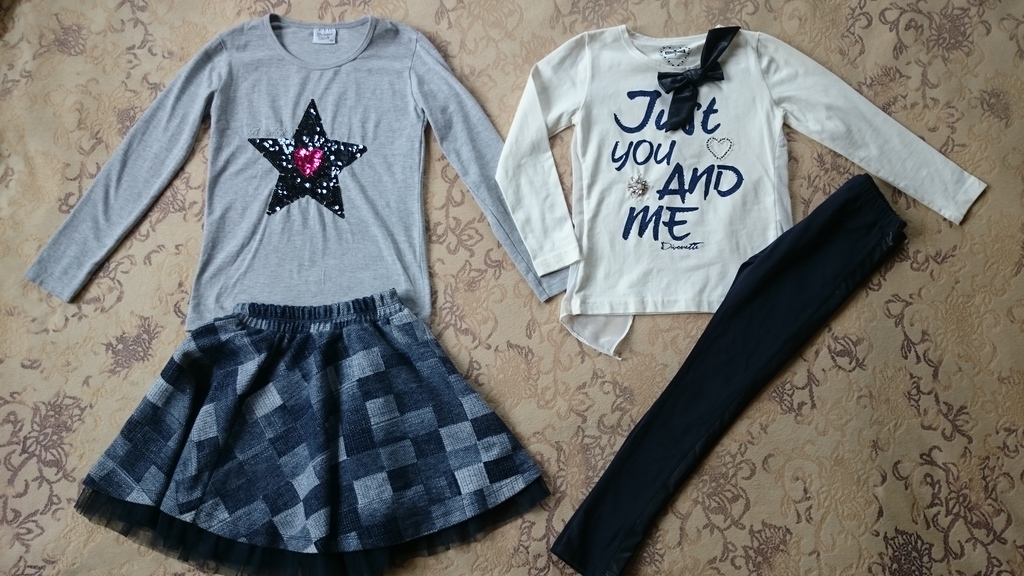 1.Кофта Stilnyashka 140, хорошо на 134, 80 %хлопок, нюансов не нашла, со штанами носили как костюм. цена 400, если комплектом то 700