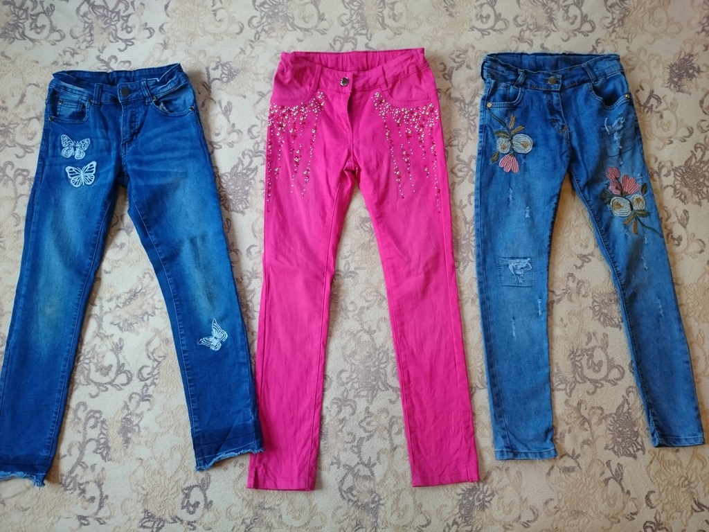3. Джинсы турция, вышивка, на р. 128-130, в очень хорошем состоянии, тонкие, хлопок со стрейч, утяжка, цена 350 руб.