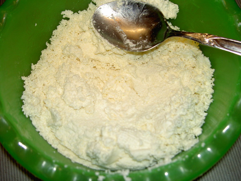 Добавить в массу творог, манку, соду и тщательно перемешать до однородности.