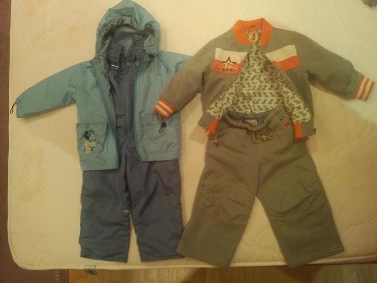 2 костюма бу: 1- синий: болоний на подкладе хб (полукомбез с закрытой грудкой +курточка с возможностью регулировки ширины капюшона и рукавов), 80-86 см - 600 руб
