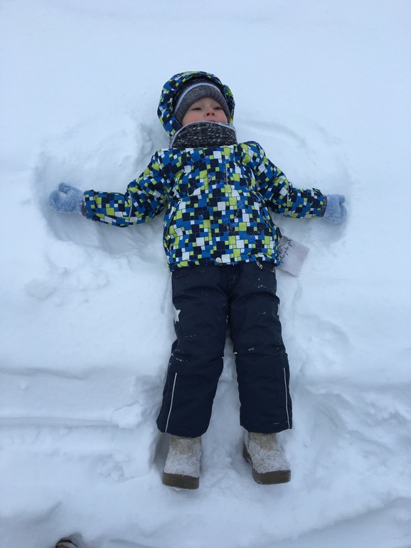 Научили Тему делать снежного ангела)) Правда вставать аккуратно потом ещё не научили 😄