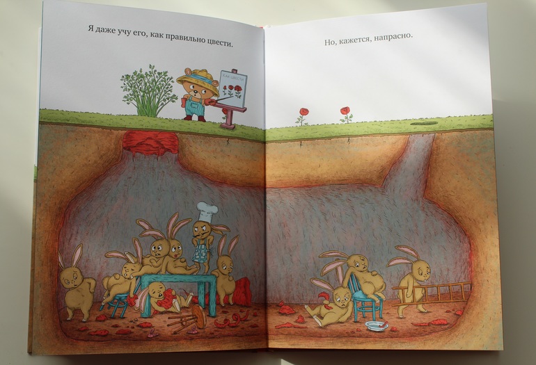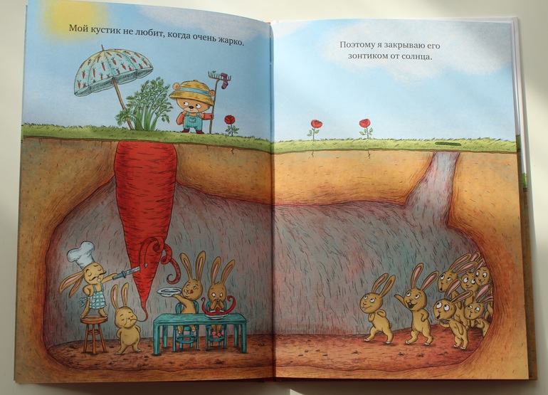 Ну а старшие дошкольники и младшие школьники, думаю, смогут оценить по праву юмор повествования и иллюстраций. Пока садовник обихаживал морковный "кустик", зайцы в подземной норке съели почти всю морковку. И выдернув корнеплод, главный герой принял его за неправильную розу, которая росла кверху ногами 😅.