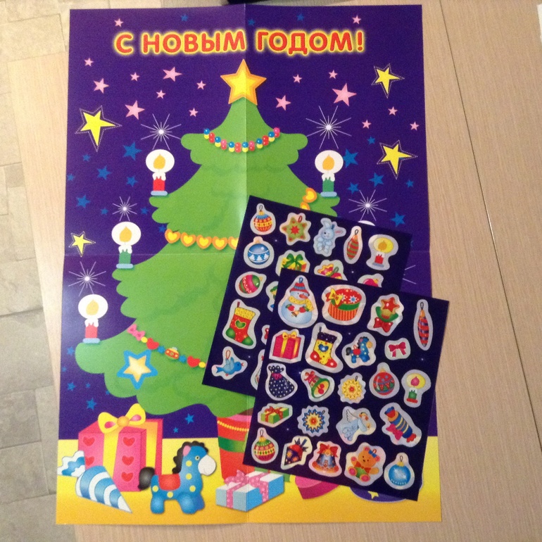 Постер с наклейками было решено прикупить как альтернативу елочке для раскрашивания, чтобы было разнообразие) Постер раскладывается в большую елочку, которую можно украшать наклейками-игрушками, которые прилагаются на двух листах. По-моему, тоже отличное развелечения для своего ребёнка и на подарочек малышу.