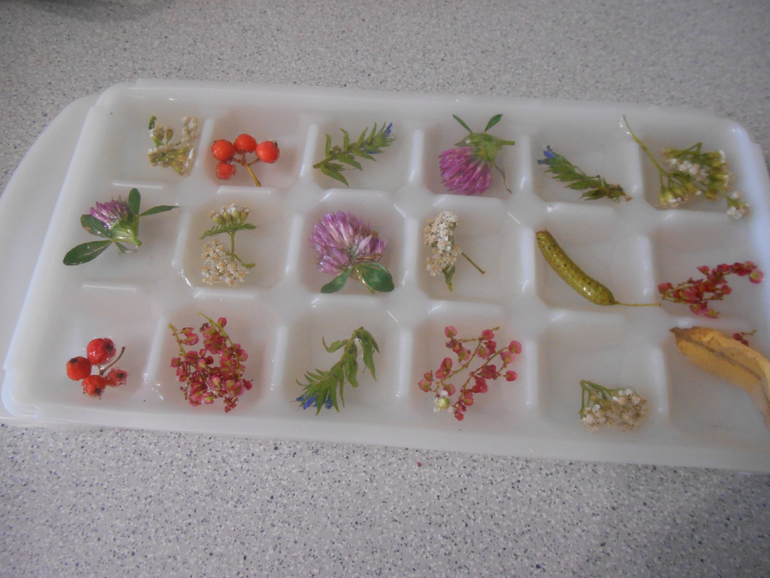 Нарвала с собой всяких цветочков и листиков и решила всё это заморозить, не знаю, может будет потом как-нибудь играть с ними)