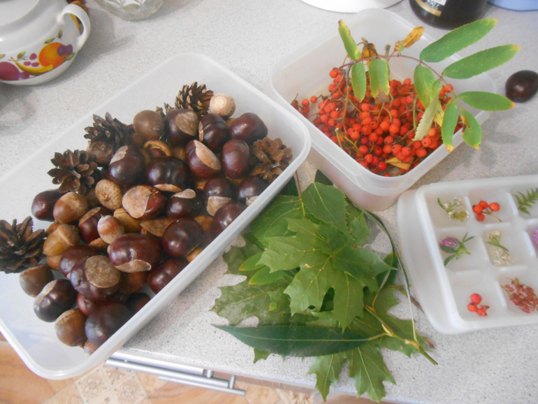 А мы вместе с Ксенией реализуем наши осенние дела. Ещё на той неделе, в очень сильный холод нас потянуло на улицу. Насобирали мы целую кучу каштанов, желудей, набрали колючих корочек от каштанов (будем делать ёжиков), нарвали рябины, ну и конечно же не обошлось и без букета из листьев.