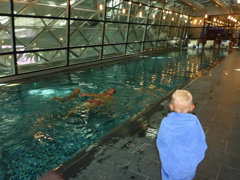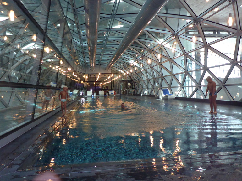 бассейн большой. Глубина средняя. Для Марата было глубоковато. Но он умеет плавать) Внутри тепло....но я потом все равно замерзла и ходила греться в джакузи.