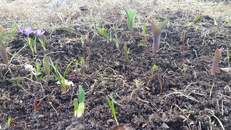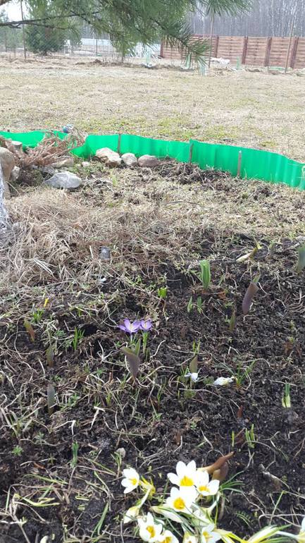Чеснок уже весь взошел, зацвели крокусы и вылезли тюльпаны, нарциссы и гиацинты. Роза вроде жива....но вот думаю не рано ли он ее открыл...а то там снег был говорят.