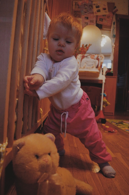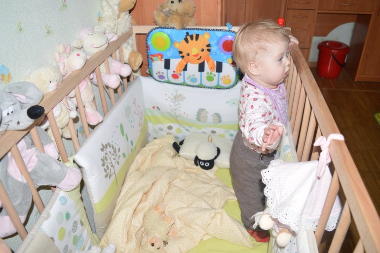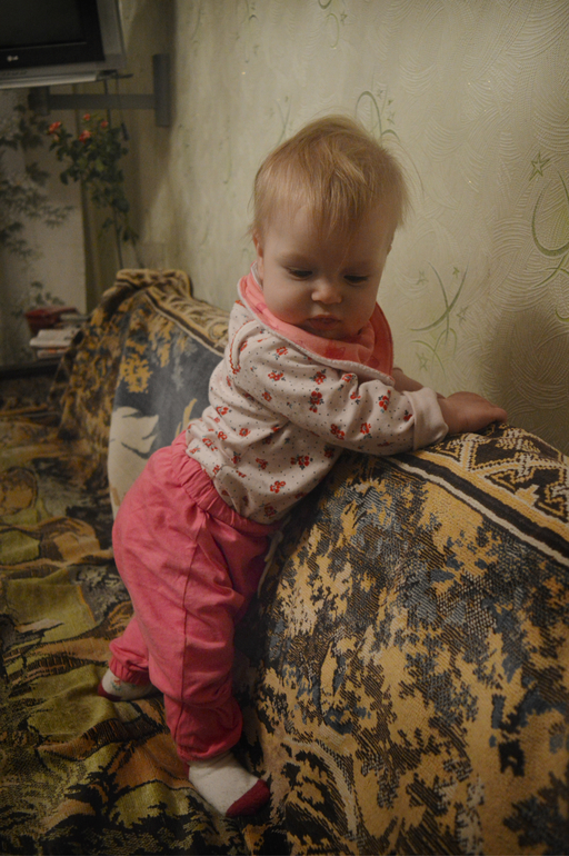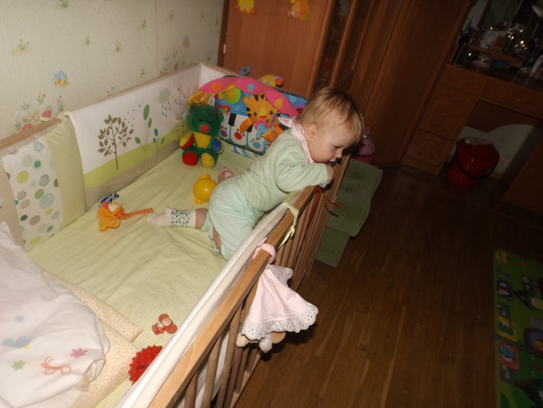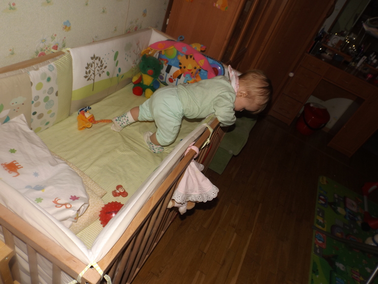 Пока не встает, но жаление такое у нее есть, не совсем еще понимает как это делается)