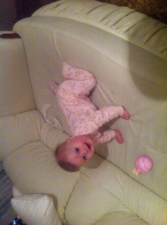 Во-первых она научилась ползать по-пластунски, не много, но ес ли надо - ползет. Часто стоит на четвереньках, качается, любит облокачиваться на меня, раскачиваться и вставать на коленки) Так веселит это ее