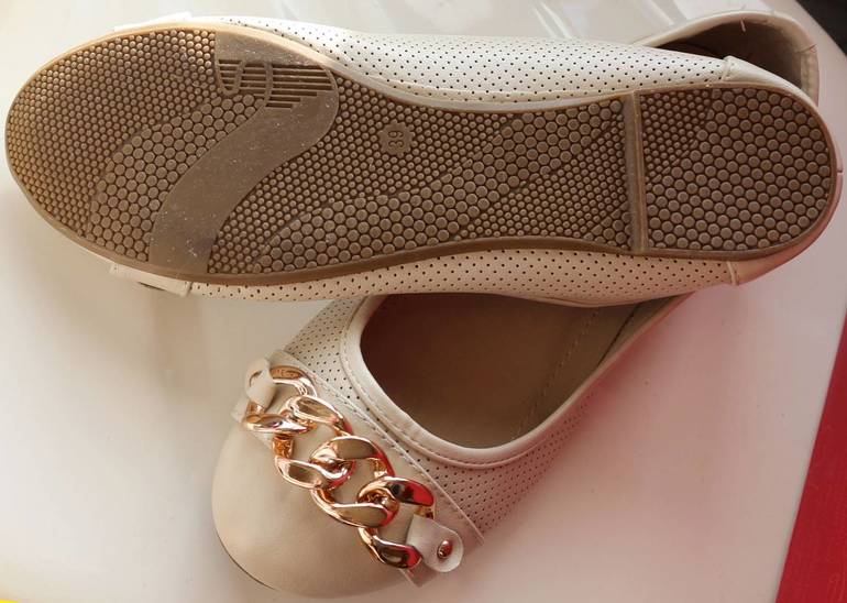 Мой обменНовые лёгкие светло-бежевые балетки с блестящей фурнитурой "звенья". Р-р 39. Длина внутр. стельки 250мм. Экв. 1200