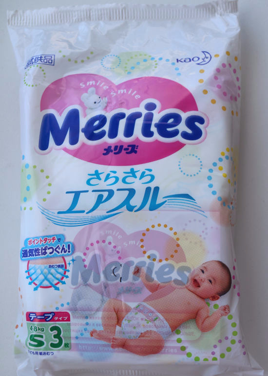 9. Подгузники Merries р.S, 4-8 кг. 3шт. Экв. 150