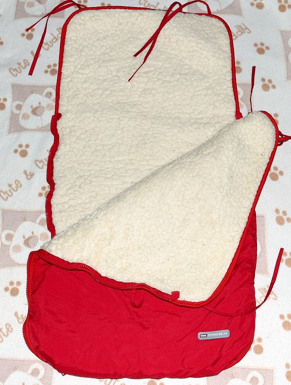 12. Теплый конверт на молнии. Экв. 700. Общая длина - 81 см, передний клапан - 64 см, ширина - 45, Молния-трактор с двумя бегунками, разъемная.
