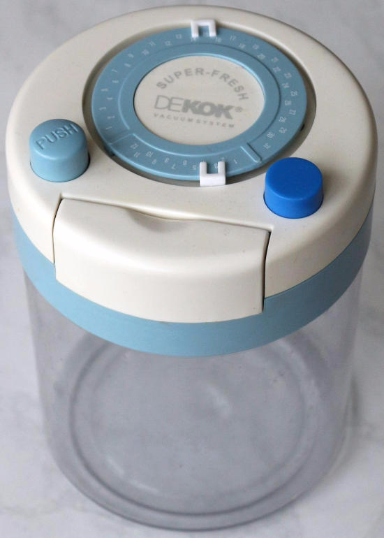 8. Вакуумный контейнер Dekok с отсосом и указателем даты. Высота с крышкой: 13 см, диаметр: 10 см. Экв. 300