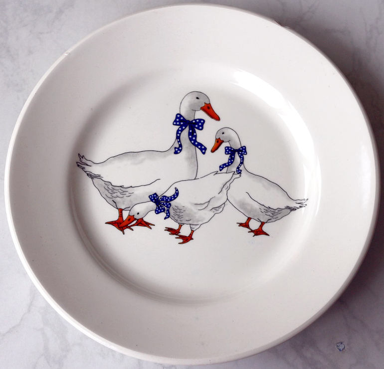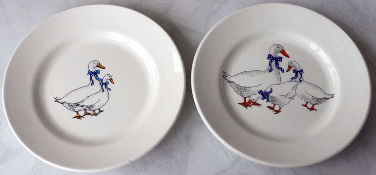 5. Новые, с этикетками, тарелочки "Гуси". Диам. 18см. Есть незначительные дефекты по краям (см. фото). Экв. 200 за обе.