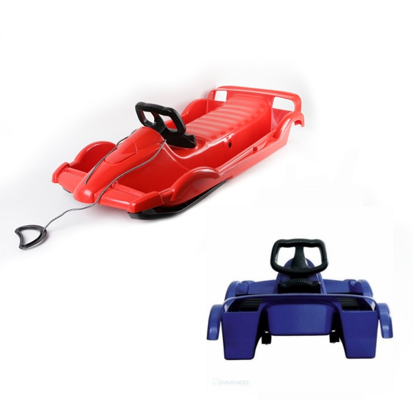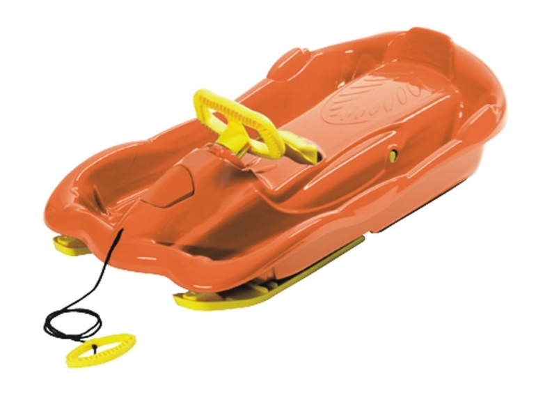 Имеет рельефную анатомическую форму с удобным нескользящим сиденьем и небольшими бортиками - это обеспечивает поддержку спины и боковую защиту. Имеется веревка с удобной ручкой. Также есть дополнительные ручки сбоку и сзади для переноса санок