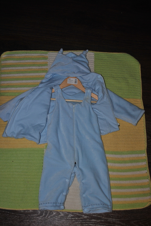 Очень нежный и красивый комплект, утепленный синтепоном. Подкладка - 100% хлопок.Штанишки на лямочках, кнопочки между ножек. Курточка с капюшоном. Украшены нежной вышивкой и аппликацией.ФИрма София (Польша) Состояние отличное, самовывоз м.Кузьминки 600р