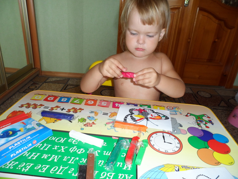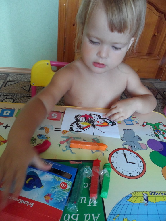 Начали занятия с Бабочки-красавицы, разукрасив ее пластилином.