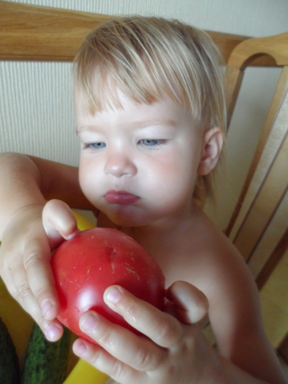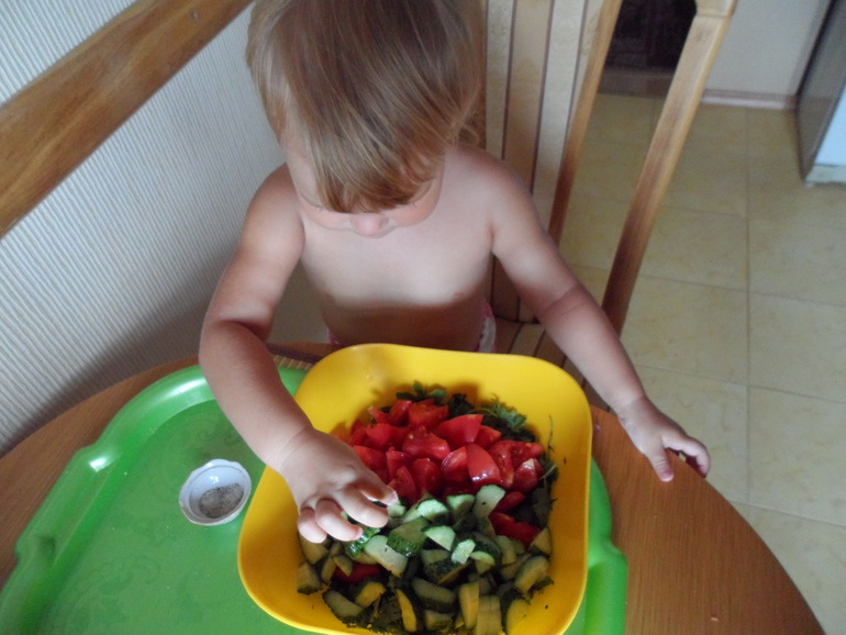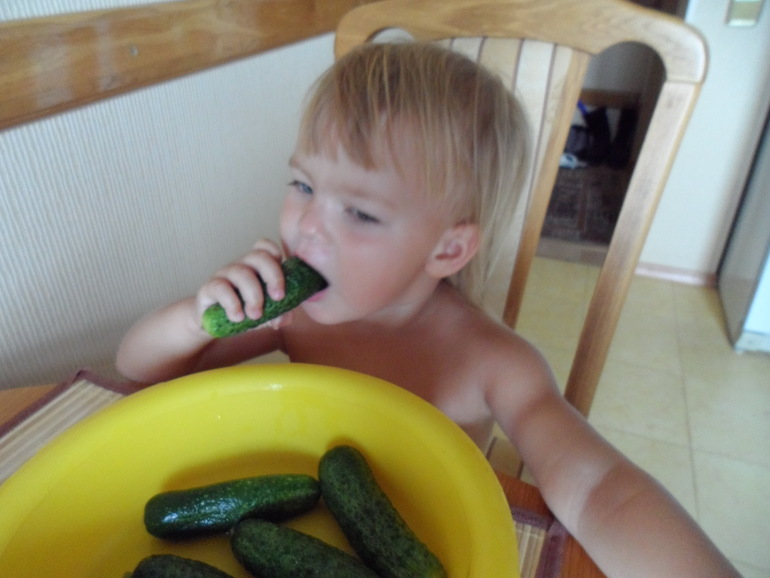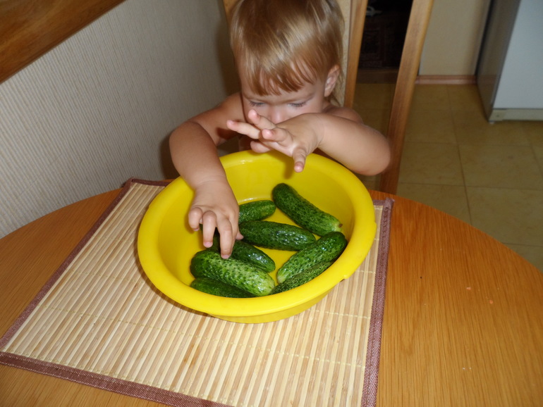 Решили мы с доченькой приготовить папе салат из огурцов и помидоров. Рассмотрела Альбинка огурчики,как раз были свежие,все в пупырышках.