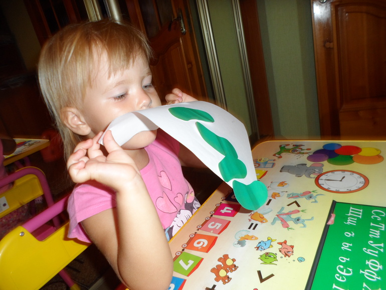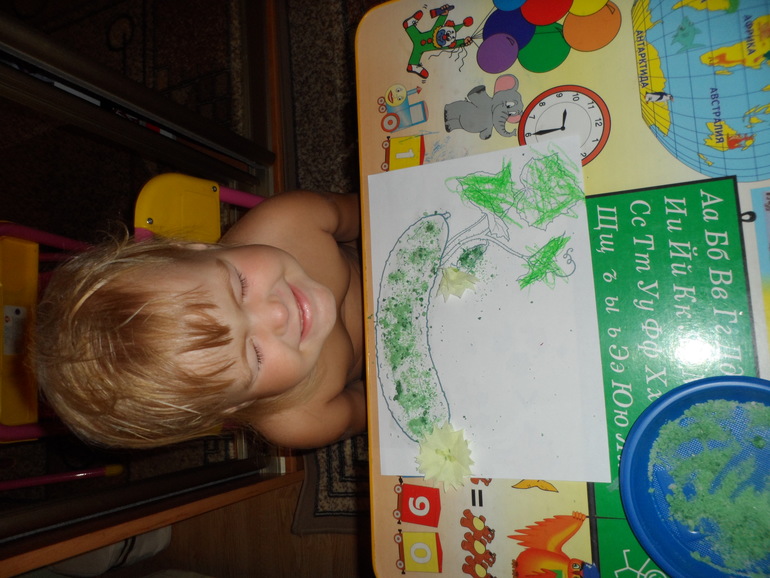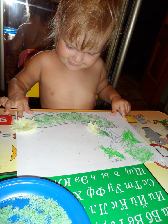 Папа был очень доволен. А мы, пока он наслаждался нашим кулинарным творением, сделали аппликацию с солью, подкрашенной гуашью.