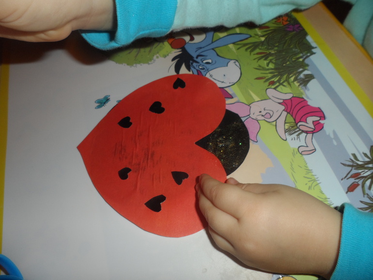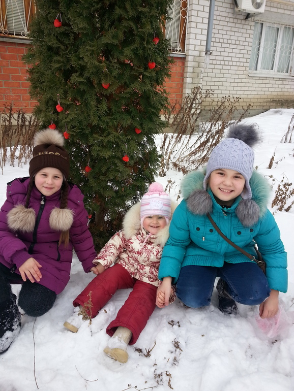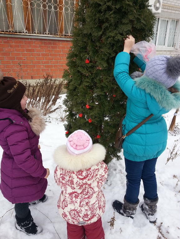Накануне праздника, я немного подготовилась, наморозив красных сердечек с петельками, тк утром собирались украсить туйку во дворе сердечками. Это занятие (и туйка тоже) становятся уже традиционными.