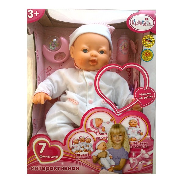 "Красивая кукла Аленка станет настоящей подружкой маленькой девочки от 3 лет и научит девочку быть заботливой мамочкой! Аленка такая затейница! Она поет песенки, знает стихи, скороговорки, загадки и считалочки. С Аленкой можно играть в 7 различных игр: