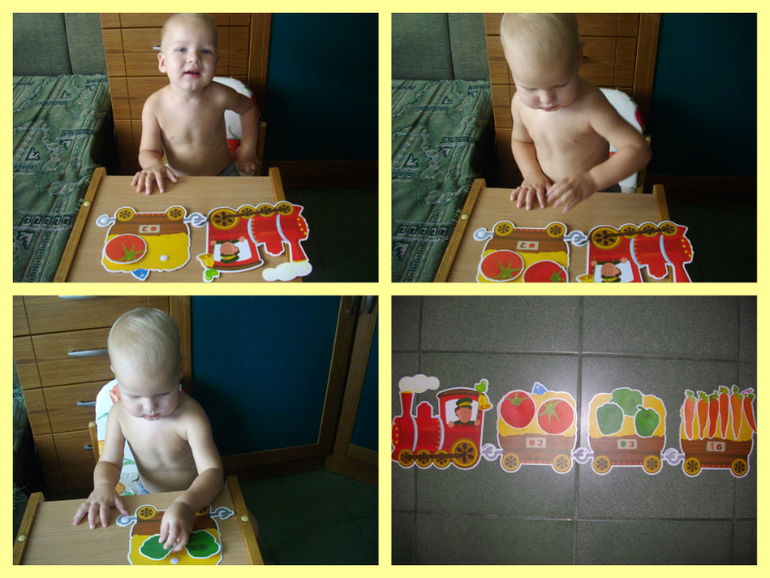 Потом играли в игру по теме овощи, распределяли по вагончикам, считали.