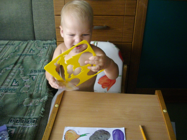 Пыталась познакомить с трафаретом для рисования, не воодушевил. Стал почти сразу засовывать обратно в пакет.