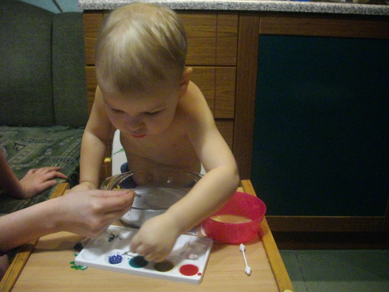 Жаль у меня не было жидких красителей, они ярче. Пришлось воспользоваться гуашью. Но дочка с сыном все равно были увлечены необычным рисованием.