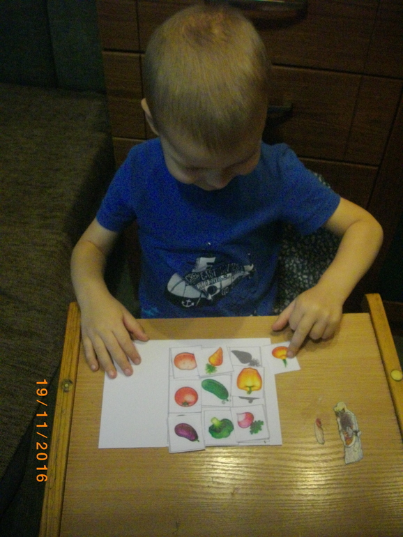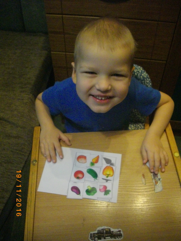 Карточки посмотрели, любимые овощи назвали. Угадать, какой это овощ, не очень получилось. На вопрос, где растут овощи, Макс ответил: "В земле, мама ты что не знаешь?". Как собирают овощи, проговорили вместе. И один-много тоже сделали вместе. Очень понравилась игра "Что исчезло?. Три карточки просто. Робота кормили, объелся.