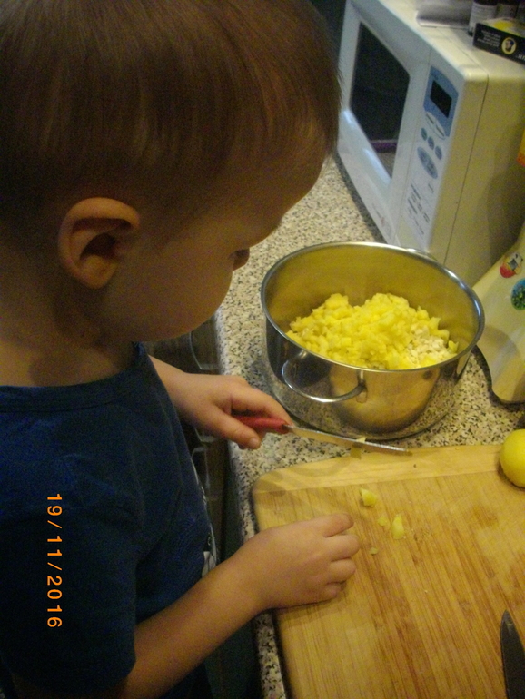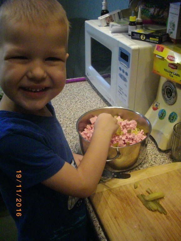 Помог делать салат. Как раз просил нож в пятницу, а в субботу я предложила порезать картошку, колбасу и огурцу. Сделал все аккуратно и до конца.