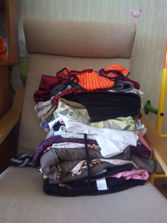 И это только мое: юбки, брюки, кофты, платья, рубашки! Щас еще футболки мужа переберу. Поедет все к маминой соседке, там все печально с финансами.