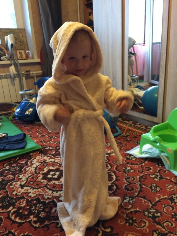А также купили Яру халат, чтобы он быстро мог выйти к папе на балкон, но немного не угадали с размером