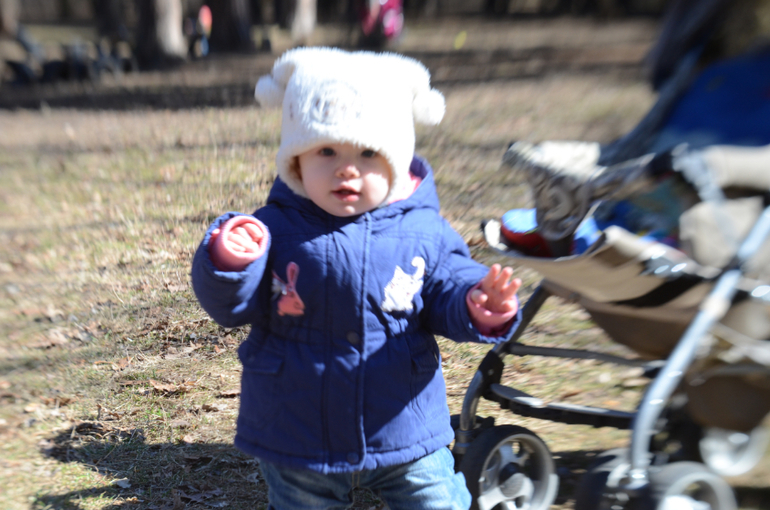 Стоит у опоры , иногда отпускает руки и стоит несколько секунд,потом вспоминает ,что не держится, начинает шататься и опят хватается за опору. Гуляет спокойно только во сне( То ли зима не нравится, то ли в комбезе не удобно...в общем не знаю. Прогулки подгадываю под сон.