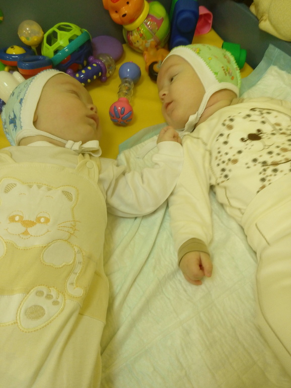 Ой, они уже балакают друг с другом на своем))) Нет, ты что, это мы на лфк ходили, под шапку одеваем, они от чепчиков отказались как только из роддома домой приехали. Теперь одеваться на улицу у нас со скандалом, только чепчик надевается сразу истерика))